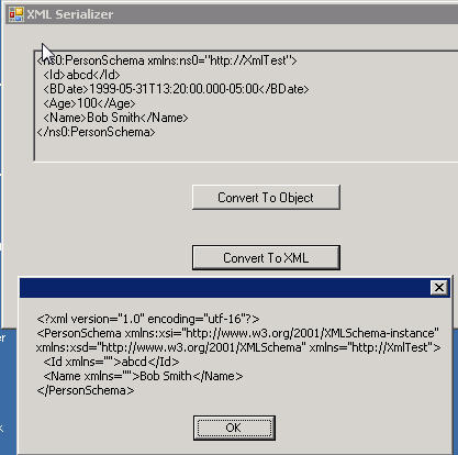 So far so good. I’ve built a really simple application that takes an XML string and loads it into my .NET object via the XmlSerializer Framework object. On my development machine, executing this step results in a MessageBox window that shows the object properties after the Xml deserialization occurred.