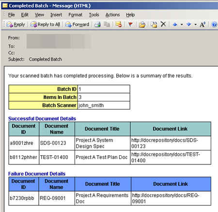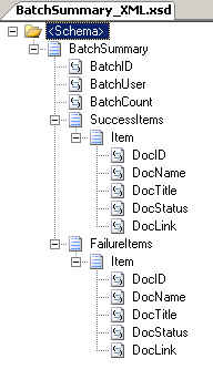 The next schema represents the email content being sent back to the initiator. There is a summarization of the batch of records they submitted, and then one section where successfully processed documents are recorded, and a section where failed documents are recorded.