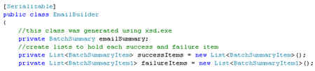 The meat of this orchestration is the part that builds up the email message. I have a helper class that accepts data from each batch message, and stores it in a member variable until I’m ready to return the completed, aggregate message. Now, I could have chosen to build some sort of custom type object, and when the loop was complete, turn that object into the XML representation of my email schema. But, I’d rather cut out that middle man. So, I passed my “BatchSummary” schema (above) through the .NET Framework xsd.exe tool to get a type object that directly mapped to the schema. That type is used as a member variable of my helper class.
