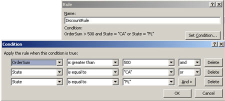So let’s say that you want to execute the following comparison: “If the sum of the order is greater than $500, and, the customer is from either CA or FL, then set a 10% discount rate.” In essence you have a “A & (B | C)” situation. So my pal had a rule that fired which checked these conditions. On the first pass, his rule conditions looked like this: