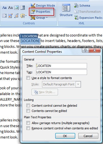 Now I’m going to sprinkle a few Text Content Controls throughout my document. The text of each control should indicate the type of content that goes there. For each content control on the page, select it and choose the Properties button on the ribbon so that you can provide the control with a friendly name.