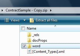At this point, I have four Content Controls in my document and each has a friendly title. Now we can save and close the document. As you probably know by now, the Office 2007 document formats are really just zip files. If you change the extension of our just-saved Word doc from .docx to .zip, you can see the fun inside.
