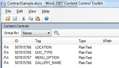 I looked a few options for manipulating the underlying XML content and finally ended up on the easiest way to update my Content Controls with data from outside. First, download the Word 2007 Content Control Toolkit from CodePlex. Then install and launch the application. After browsing to our Word document, we see our friendly-named Content Controls in the list.