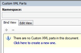You’ll notice that the XPath column is empty. What we need to do next is define a Custom XML Part for this Word document, and tie the individual XML nodes to each Content Control. On the right hand side of the Word 2007 Content Control Toolkit you’ll see a window that tells us that there are currently no custom XML parts in the document.