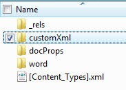 Go ahead and save the settings and close the tool. Now, if we once again peek inside our Word doc by changing it’s extension to .zip, we’ll see a new folder called CustomXml that has our XML definition in there.