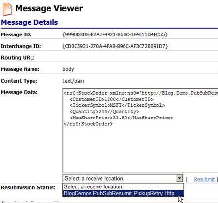- Have indicators in the message to indicate targets/retries and filter those out of send ports. We could add routing instructions to a message that specified a target system and have filters in send ports so only ports listening for that target pick up a message. The ESB Toolkit lets us edit the message itself before resubmitting it, so we could have a field called “target” and manually populate which send port the message should aim for.