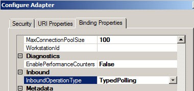 After choosing the sqlBinding as the adapter of choice, I chose to configure my URI. After setting a polling ID, server name and database name on the URI Properties tab, I switched to the Binding Properties tab and set the adapter to use Typed Polling.