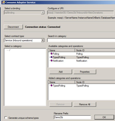 With my URI configured, I connected to the database, switched to the Service contract type (vs. Client), I’m able to choose the TypedPolling operation for my database.