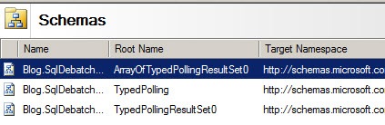 The reason that you had to create a new schema when leveraging the old adapter is that when you debatched the message, there was no schema matching the resulting record(s). With the WCF-SQL adapter, you’ll see that we actually have three root nodes as part of the generated schema. We can confirm this by looking at the Schemas section in the BizTalk Administration Console.