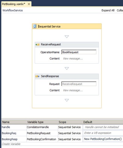 First off, I created a new .NET 4.0 Workflow Service. This service accepts bookings into a Pet Hotel and returns a confirmation code. I created a pair of objects to represent the request and response messages.