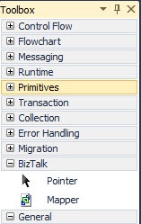 Let’s return to our workflow. When I installed the BizTalk 2010 beta, I saw a new shape pop up on the Windows Workflow activity palette. It’s under a “BizTalk” tab name and called “Mapper.”