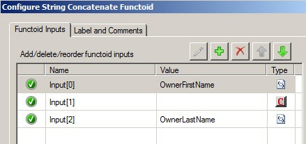 What’s pretty cool is that besides getting the graphical mapper, I also get access to all the standard BizTalk functoids. So, I dragged a “Concatenate” functoid onto the map and joined the OwnerLastName and OwnerFirstName and threw it into the OwnerName field.