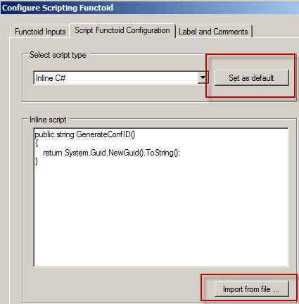 Next, I want to create a confirmation code out of a GUID. I dragged a “Scripting” functoid onto the map and double clicked. It’s great that double-clicking now brings up ALL functoid configuration options. Here, I’ve chosen to embed some C# code (vs. pointing to external assembly or writing custom XSLT) that generates a new GUID and returns it. Also, notice that I can set “Inline C#” as a default option, AND, import from an external class file. That’s fantastic since I can write and maintain code elsewhere and simply import it into this limited editor.