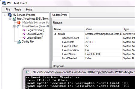 When I send both a California event update request and then a Washington event update request to this Routing Service, I can see that both one-way updates successfully routed to the correct underlying service.