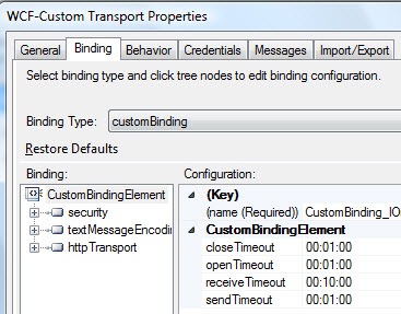 Now within the BizTalk Admin Console, I imported one of the bindings that the WCF Service Consuming Wizard produced. This makes life simple since there’s virtually nothing you have to change in the BizTalk send port that this binding produces.