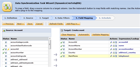 On the next wizard page, I decided to not apply any filters on the Dynamics CRM Online data. So, ALL accounts should be copied over to my database table. I was now ready for the data mapping exercise. The following wizard page let me drag-and-drop fields from the source (Dynamics CRM Online) to the target (SQL Server 2008 R2).