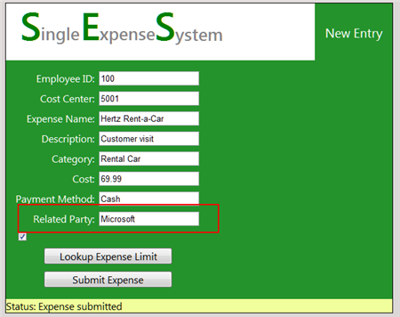 Let’s commit some fraud on my website! I went to my Expense website, and according to my StreamInsight query, if I submitted more than 2 expenses for single client (in this case, “Microsoft”) within a 30 second window, a fraud event should be generated, and I should receive a phone call.