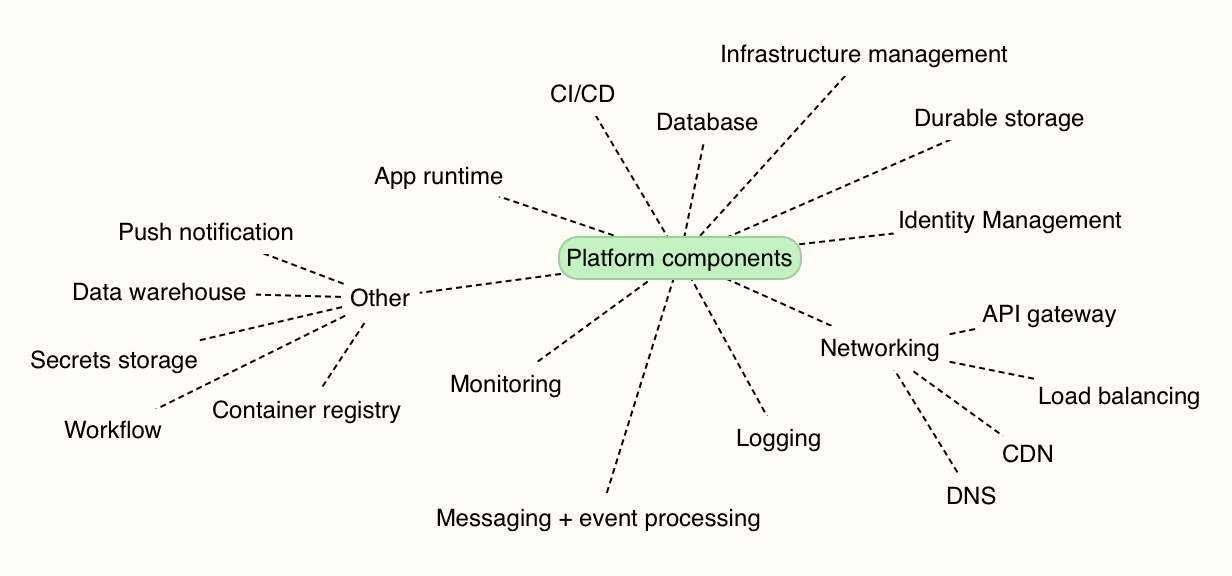I made a map of the non-negotiable capabilities. One way or another, you’re stitching these things together. You need an app runtime (e.g. VMs, FaaS, containers), databases, app deployment tools, infrastructure/config management, identity systems, networking, monitoring, and more. Pretty much all your running systems depend on this combination of things.