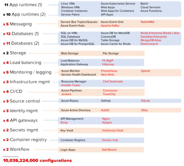 For math purposes, let’s calculate unique combinations by assuming your platform uses one thing from each category. The exception? App runtimes and databases. I think it’s more likely you’re using at least a pair of runtimes (e.g. Azure App Service AND Azure Kubernetes Service, or, Windows VMs AND Linux VMs), and a pair of databases. You may be using more, but I’m being conservative.
