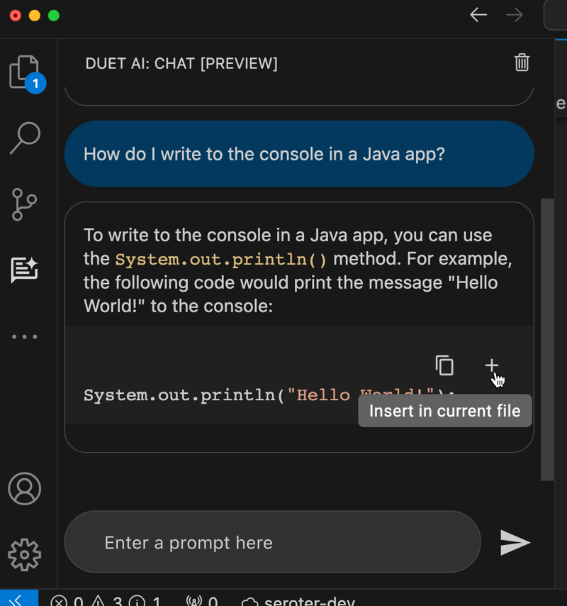 I showed above that the coding assistant gives me code or YAML. From within the IDE chat, I can do something like ask “how do I write to the console in a Java app” and take the resulting code and immediately inject it into the code file by clicking a button. That’s a nice feature.
