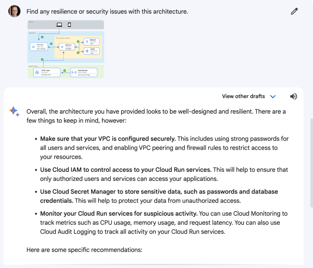 I may sketch out my initial architecture in our free and fun Architecture Diagramming Tool and then ask Bard to find resilience or security flaws in my design.