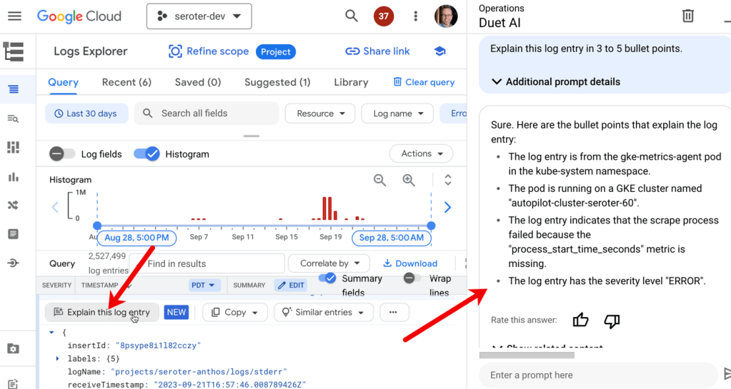 Another case is Duet AI integration with Cloud Logging. Log entries have a “explain this log entry” button which asks the integrated Chat experience to summarize the log and make it more digestible.