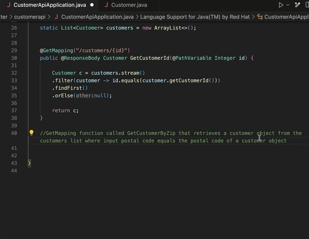 First, the code assistance for developers in the IDE is helpful. I don’t code often enough to remember everything anymore, so instead of searching for the right syntax to use Java streams to find a record in a list, I can write a prompt comment and get back the right Java code without leaving my IDE.