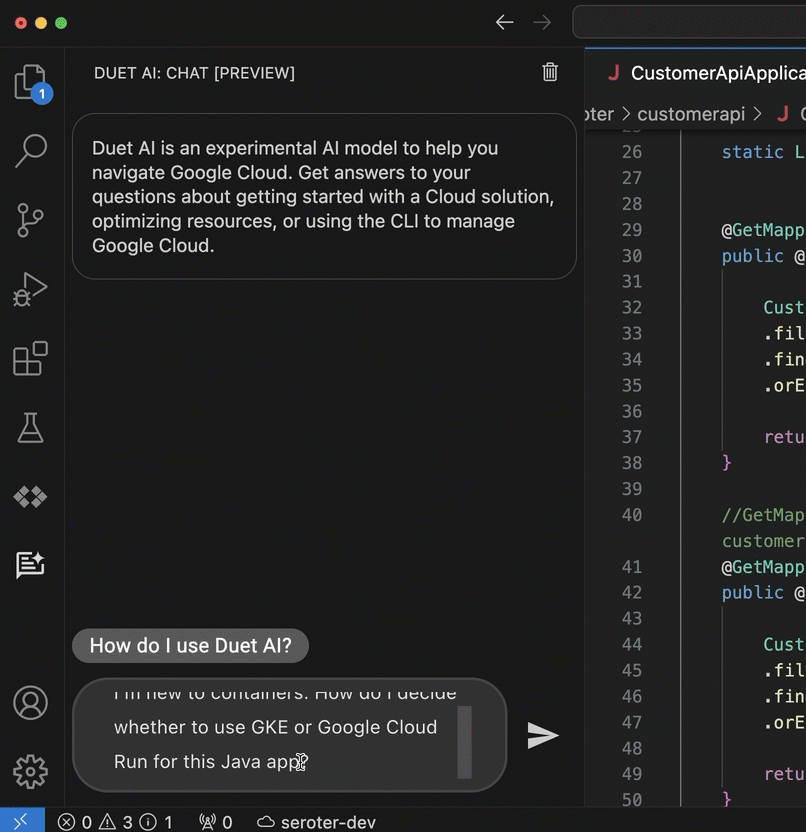 The coding assistance (code generation, and test generation) is great. But what really keeps me in a flow state is the inline chat within my IDE. Maybe I want to figure out which of the two major container services in Google Cloud I should use. And then after I choose one, how to walk through a deployment. Instead of jumping out to a browser and spending all sorts of time finding the answer, I’m doing it right where I work.
