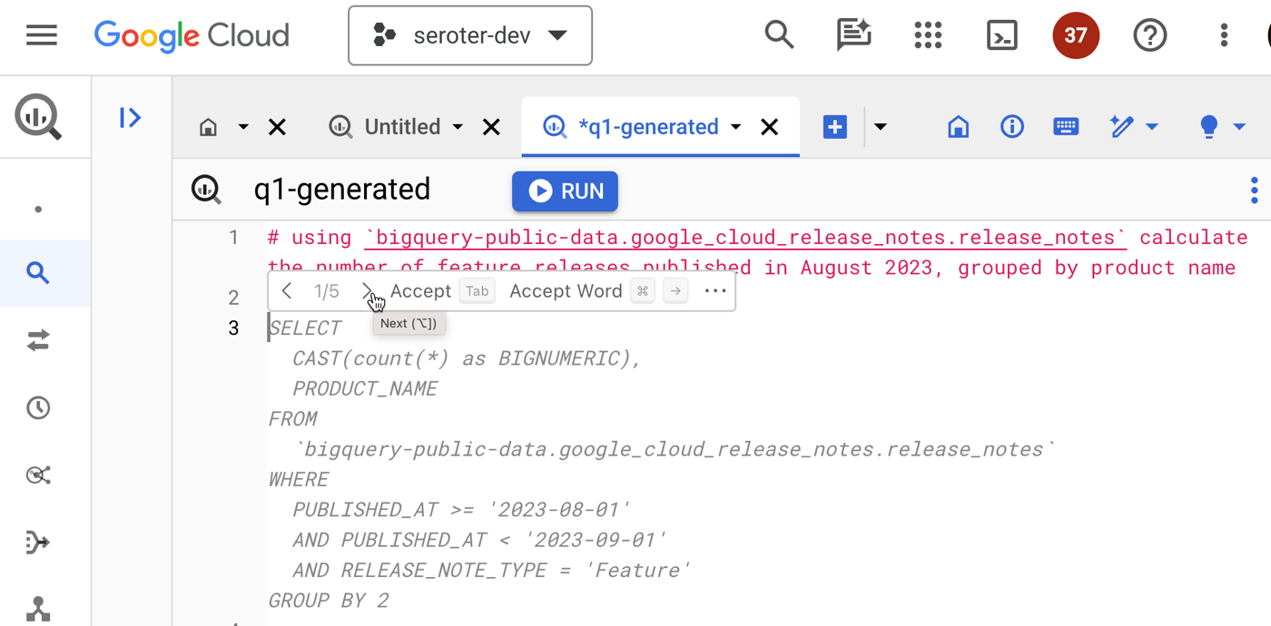 The same inline context sits in a variety of cloud services, such as BigQuery. Instead of jumping out of the Console to figure out complex query syntax, I can use natural language to ask for what I want, Duet AI infers the table schema, and generates a valid query.
