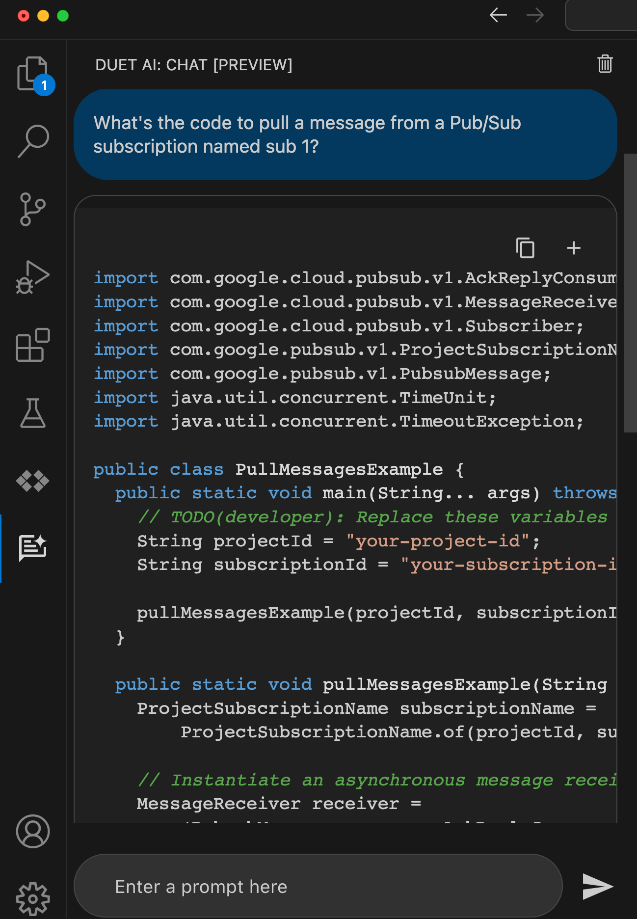 When I ask for something like “code to pull message from a Google Cloud Pub/Sub subscription” I want quality code back that works at scale. Sure enough, I got back code that looks very similar to what a dev would find by hunting through our great documentation.