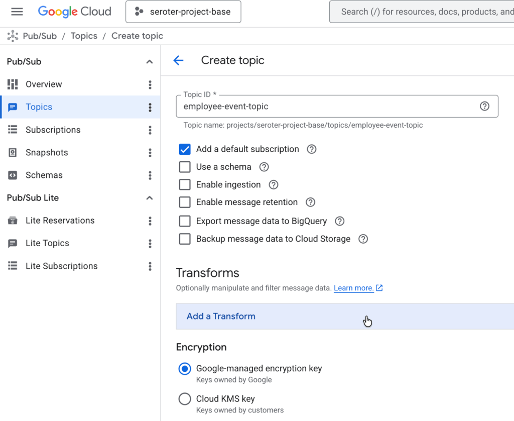 You’ll see there’s a Transforms section, but I don’t want to apply a transform to every message. So I’ll create this topic without one.