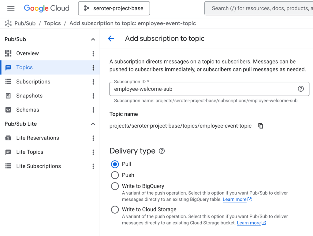 Next, I create a subscription. Pub/Sub is one of the most unique cloud messaging services because it supports push, pull, and even message replay. This sub is a simple pull-based subscription.