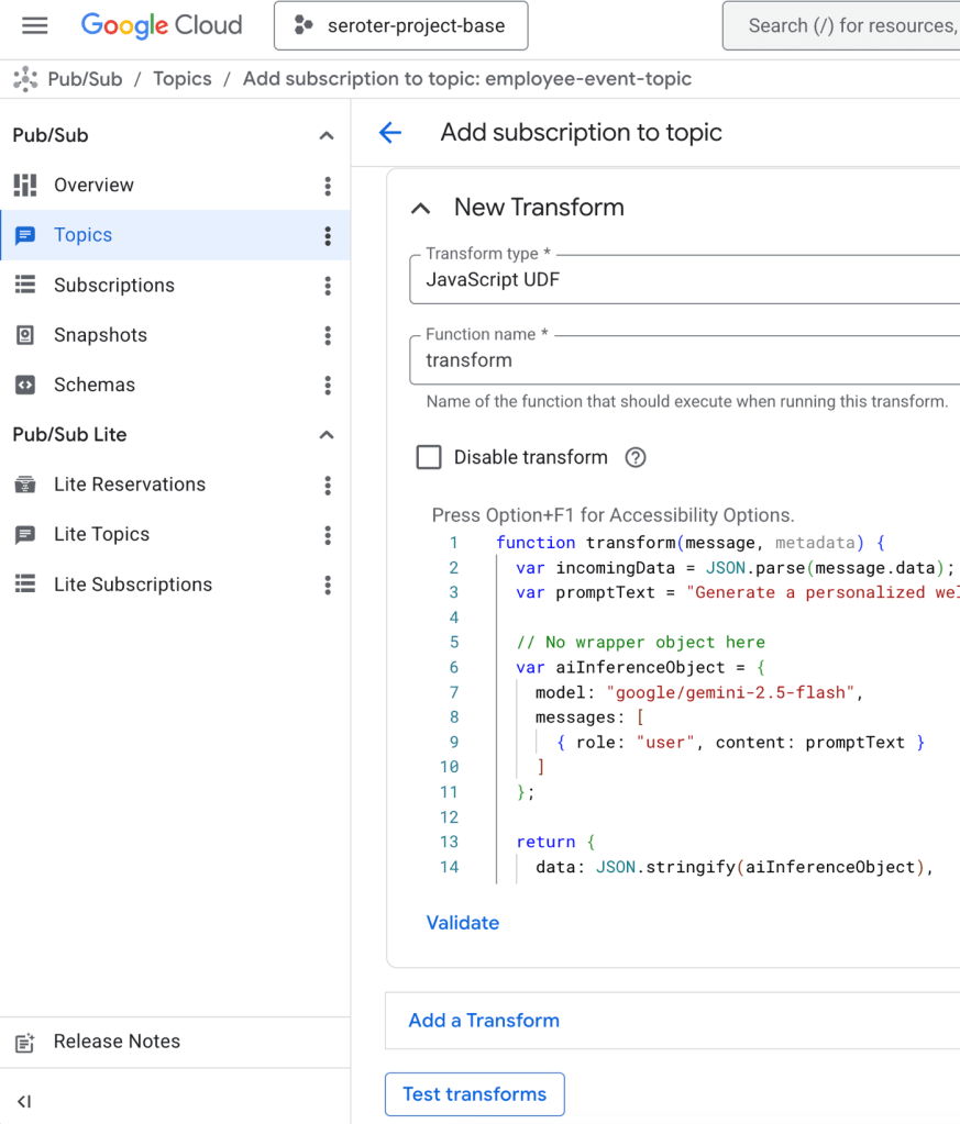 I click the Add Transform button and choose Javascript UDF. I set the function name as transform and populate the JavaScript code that sticks the original employee event into the prompt that the AI SMT expects.
