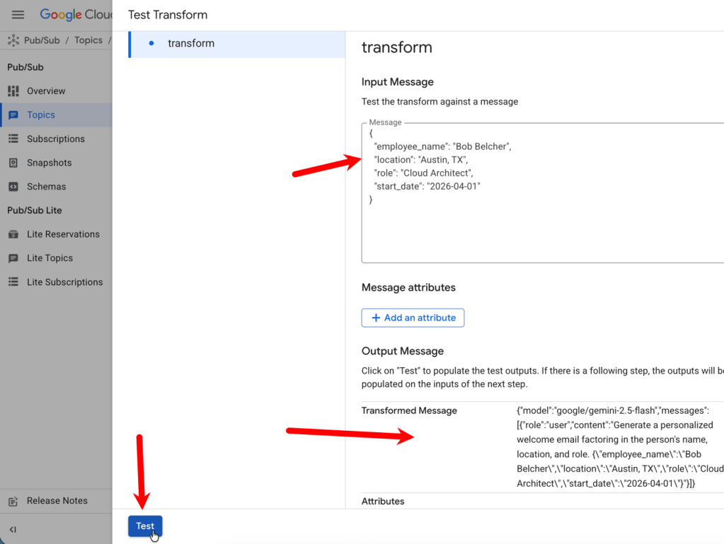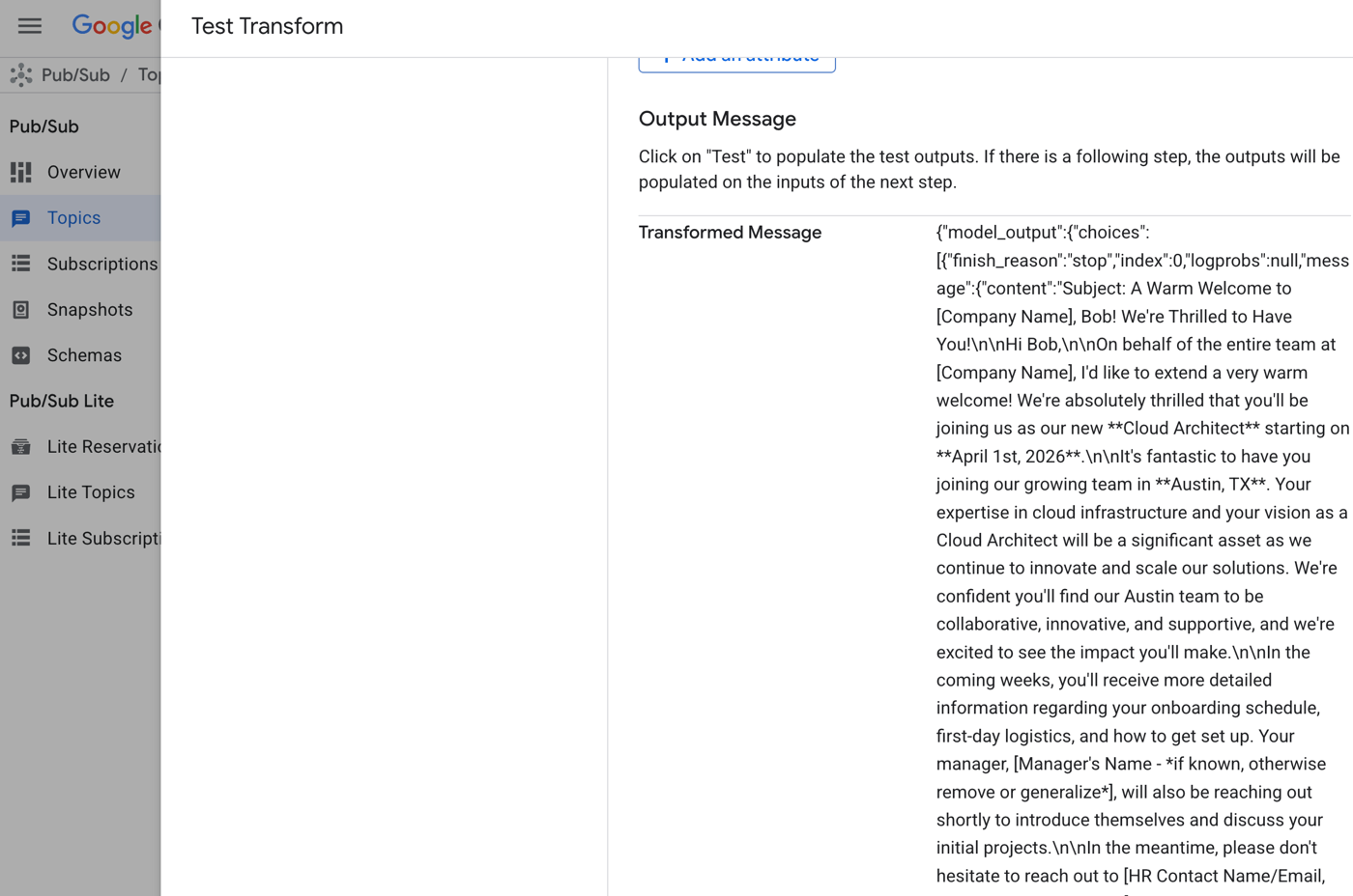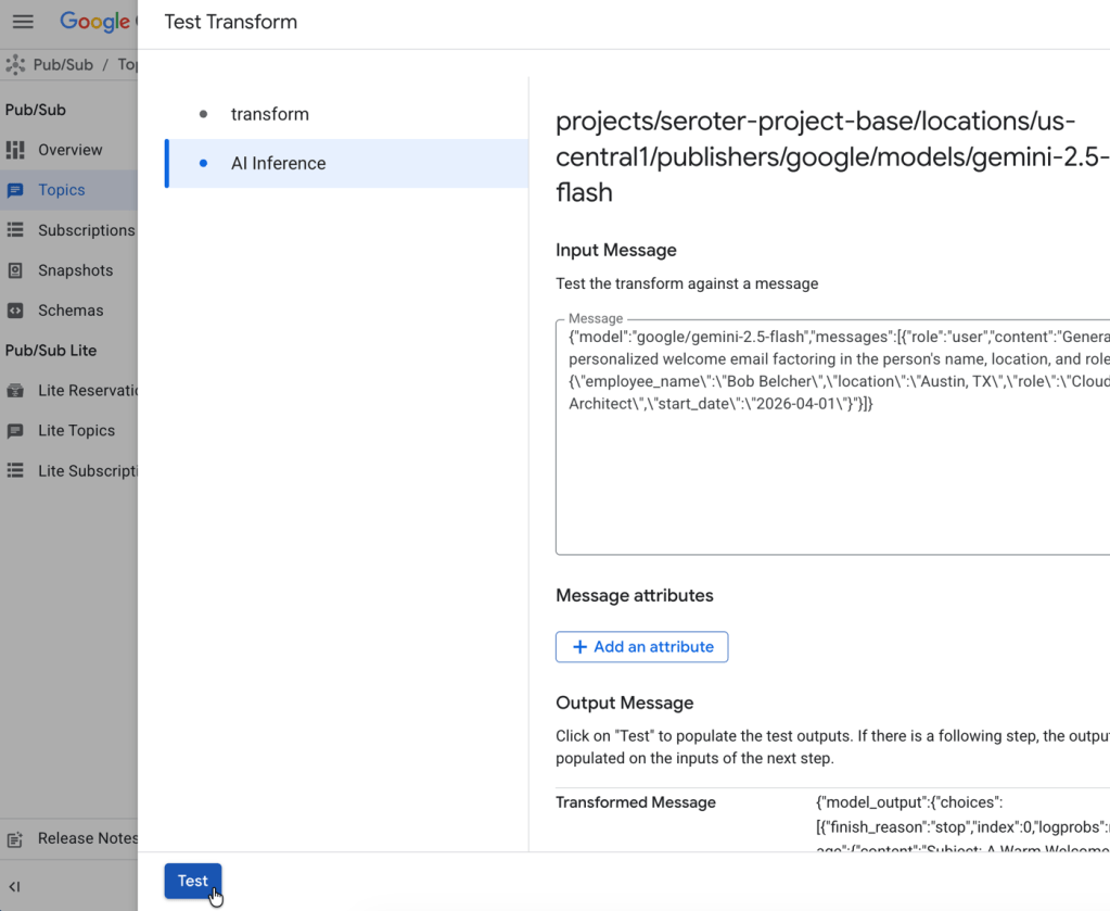 Once I save this subscription, it works like any other. Now I’ve got an LLM-enhanced Google Cloud Pub/Sub!