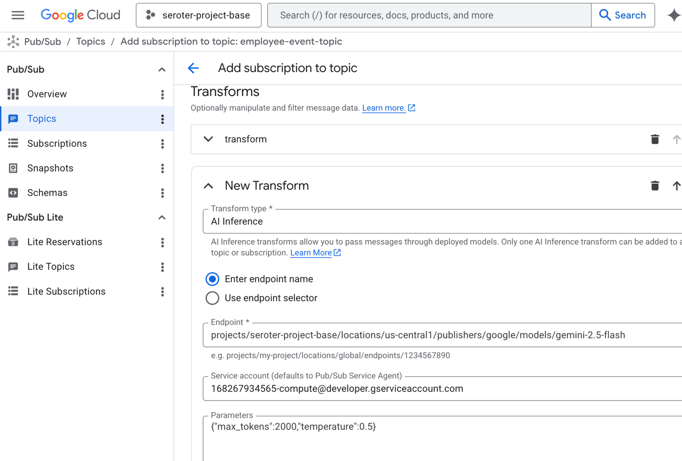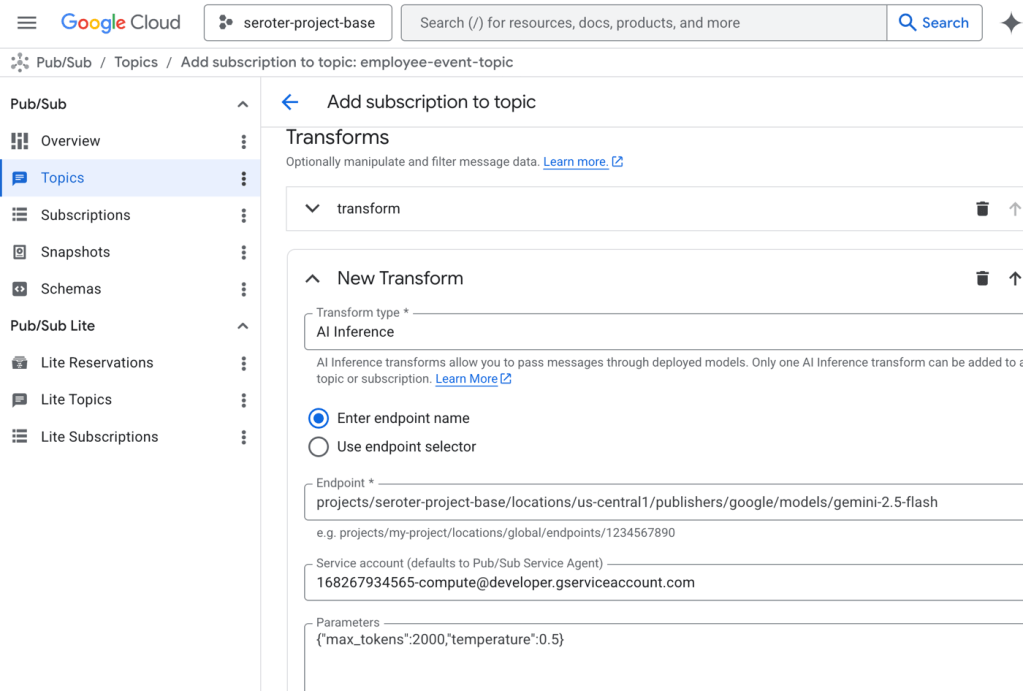 Now I add the AI SMT to the sequence of transforms. I chose AI Inference and then picked the managed Gemini model from Vertex AI. I could have also chosen any number of managed models from DeepSeek, Mistral, or Anthropic. Or even chosen my own model endpoint. I also picked a service account that had access to Vertex AI models. And I set a couple of parameters for max token count and temperature.