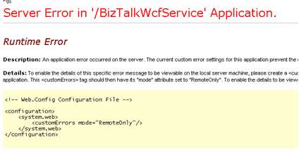 That’s it for the receive location configuration. I need to enable the receive location in order to instantiate the WCF service host. If I try to browse to my service URL while the location is disabled, I get a “page cannot be displayed” error. Once I enable the location, and hit my made-up URL in the browser, I can see the service description. Note that if I had not created the serviceMetadata behavior, I would have received a “Metadata publishing for this service is currently disabled.” message when viewing my service in the browser.