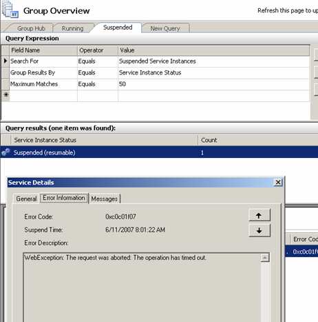 Based on the interval you provide (past day, 2 weeks, 6 months, etc), all services for the given application are shown. Getting the “application” information required joining with the BizTalkMgmtDb database. Also, I had to take into account that BizTalk database timestamps are based on UTC. So, I subtracted 7 hours from the service completion time to get accurate counts.