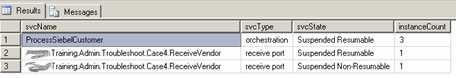 Next is the “suspended messages by application” query. For this one, I got inspiration from Scott Woodgate’s old Advanced MessageBox Queries paper. Once again, I had to join on the BizTalkMgmtDb database in order to filter by application. The result of this query looks like this: