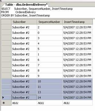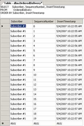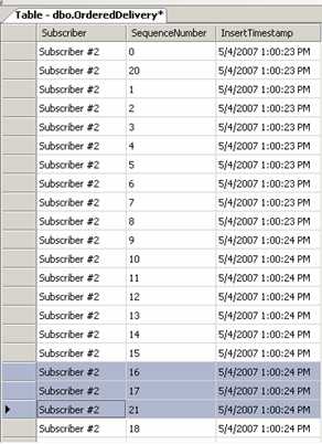 I wanted to prove that ordered delivery only impacted the corresponding port. When sending the message into BizTalk with two send ports subscribing, the data looked like this: