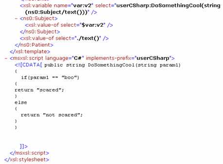 I wasn’t completely sure what would happen when the XSLT was generated for the map. Would it allow multiple functions with the same signature? Would I have to create functions called “DateConvert1”, “DateConvert2”, etc? When I did this as a test using a trial map and function, even though I had two functoids storing a function called “DoSomethingCool”, the output XSLT looked like this: