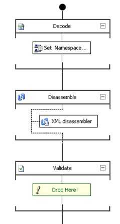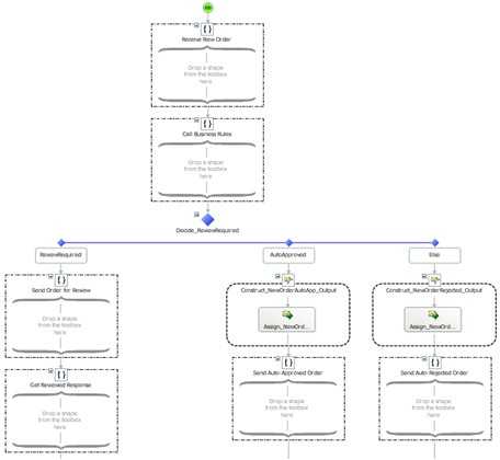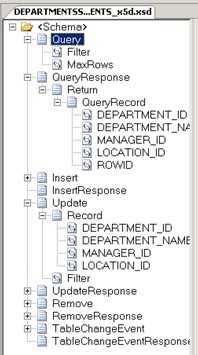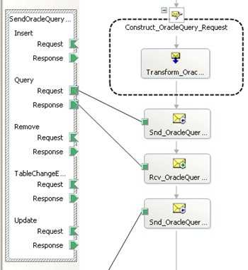 This may look familiar to you if you’ve used some of the other line-of-business adapters. You’ve got what amounts to a multi-part schema where you choose the “operation” you wish to consume. So if you want to do an “Insert” into the Oracle table, you pass in a message of type “Insert” and expect back an “InsertResponse”. In our case, I want to use the “Query” message, which allows me to apply both a filter (e.g. “department_id = 10”) and a “maxRows” property. My orchestration now looks like this after I reference the auto-generated “port type” …