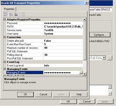In this case, I need to pull in all of records for a given table. To do this, I created a new Oracle receive location in BizTalk. Under Managing Events I chose the table I wanted to poll.