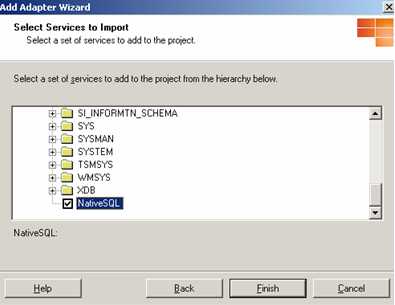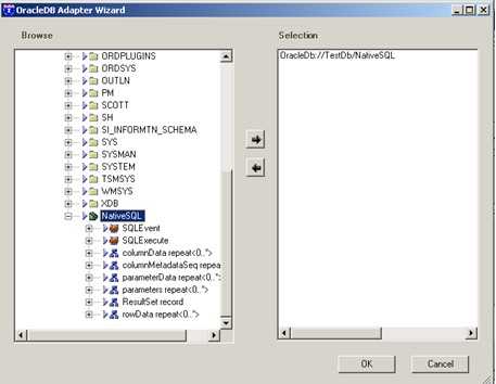The final case involves using the orchestration to make a more complicated call to the Oracle database. For instance, if you wanted to do a cross-table insert, or do any sort of operation where the “stock” operations were too restrictive. I started by using the “Add Generated Items” wizard again, but this time, I chose NativeSQL as my service to consume.
