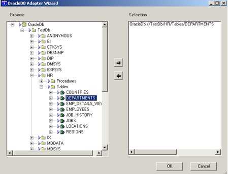 So what happens if I want to use an orchestration to call into Oracle and retrieve a dataset? First I did an “Add Generated Items” and pointed to a pre-configured Oracle receive/send port, and then I browsed to the table I wanted …