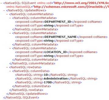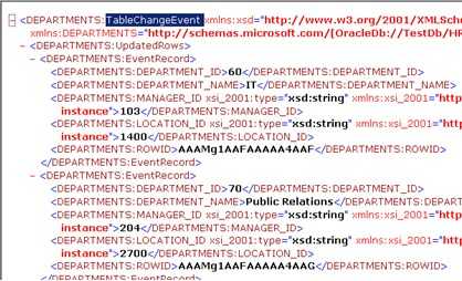 That “adapter wizard” form opens up when selecting Managing Events. Then, using a previously set up ODBC connection, the adapter interrogates the Oracle database for available tables. Here I’ve chosen the “Departments” table. Next I created a send port that had a subscription to the receive port (basic “wiretap” pattern). The output from the Oracle polling looked like this …
