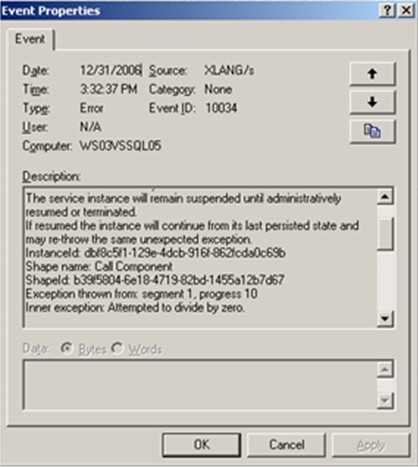Notice that the exception tells me that the workflow will continue from the “last persisted state.” If I fix the component (to avoid “divide by 0” exceptions), re-GAC the component and bounce the BizTalk host, I can resume the orchestration instance. That results in this …