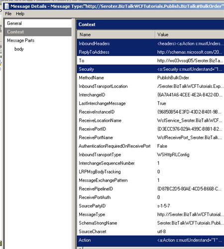 If the send port was stopped and the BizTalk-generated WCF service was called, then the message context can be inspected. Specifically, there were WCF adapter-specific context properties that were visible.