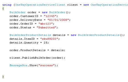 System.ServiceModel.Channels.Message bulkOrderMsg = System.ServiceModel.Channels.Message.CreateMessage(MessageVersion.Soap12WSAddressing10, “BizTalkSubmit”, order);