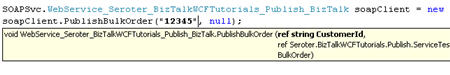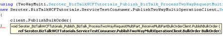 Notice that “BulkOrderType” has two parts: “BulkOrder” which maps to a schema, and “CustomerId” which is a System.String. As with the scenario above, both a “classic” SOAP service and WCF service were generated for this orchestration.