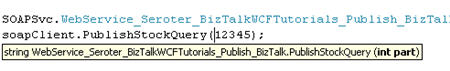 Here there is a parameter named “@int”, and a string is returned. When the WCF version of the service is called, a string is returned, as expected. This may not be a desirable solution as the caller is forced to know what exactly the unnamed parameter value should hold. Note that the SOAP adapter service CAN have distinct parameter names by using multi-part messages.